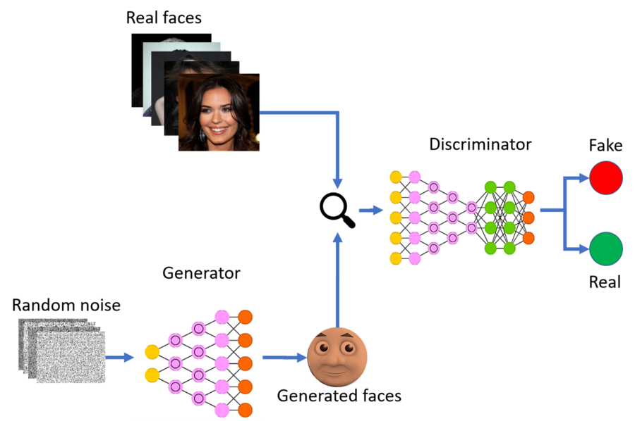 GANs consist of two parts, a Generator (unsupervised) and a Discriminator (supervised) that contest with each other like they are playing a game. A Generator creates images from scratch, while the discriminator tells if the image is real or fake based on a dataset provided to it. Based on if the Generator is found, it will improve and create better looking images so that it can fool the discriminator. Similarly, the Discriminator, will also improve if it is continually getting images wrong making its identification process more accurate. The goal is that the generator creates images so realistic, the discriminator will never know it is fake. One method of doing this is through the use of Convolutional Neural Networks (CNN). A CNN is a type of neural network that attempts to make predictions through the use of filters and data manipulation. For example, if the network takes a dog as an input, and the CNN might place a filter on it that will only look at the legs. CNNs are used in both Generator and Discriminator models to identify patterns leading to a better, more accurate algorithm.